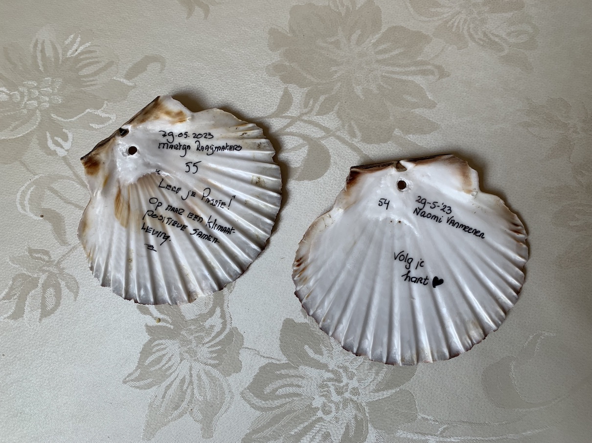 De volgende ochtend ontmoeten we elkaar opnieuw. Dit keer bij de ochtenddienst van de monniken. Na de voorgaande dienst te hebben gemist, was hier natuurlijk geen ontkomen meer aan. Het bleek een uniek kortdurend schouwspel. Daarna wandelen we via de kloostertuin en door het gebouw naar de eetkamer voor het ontbijt. We worden begeleid door dezelfde monnik. Hij blijkt geen last te hebben van ochtendhumeur, hij lacht en maakt grapjes. Hij heeft ook een speciale vraag voor ons. We mogen alle drie onze naam en een stukje inspiratie op een jakobsschelp schrijven. Ik blijk pelgrim nummer 55 te zijn, vermoedelijk van dit jaar 2023. De monnik vertelt ons dat de schelpen in juli tijdens een feestdag in een boom worden gehangen, samen met de schelpen mét inspiraties van andere pelgrims. Hoe bijzonder is dat!
